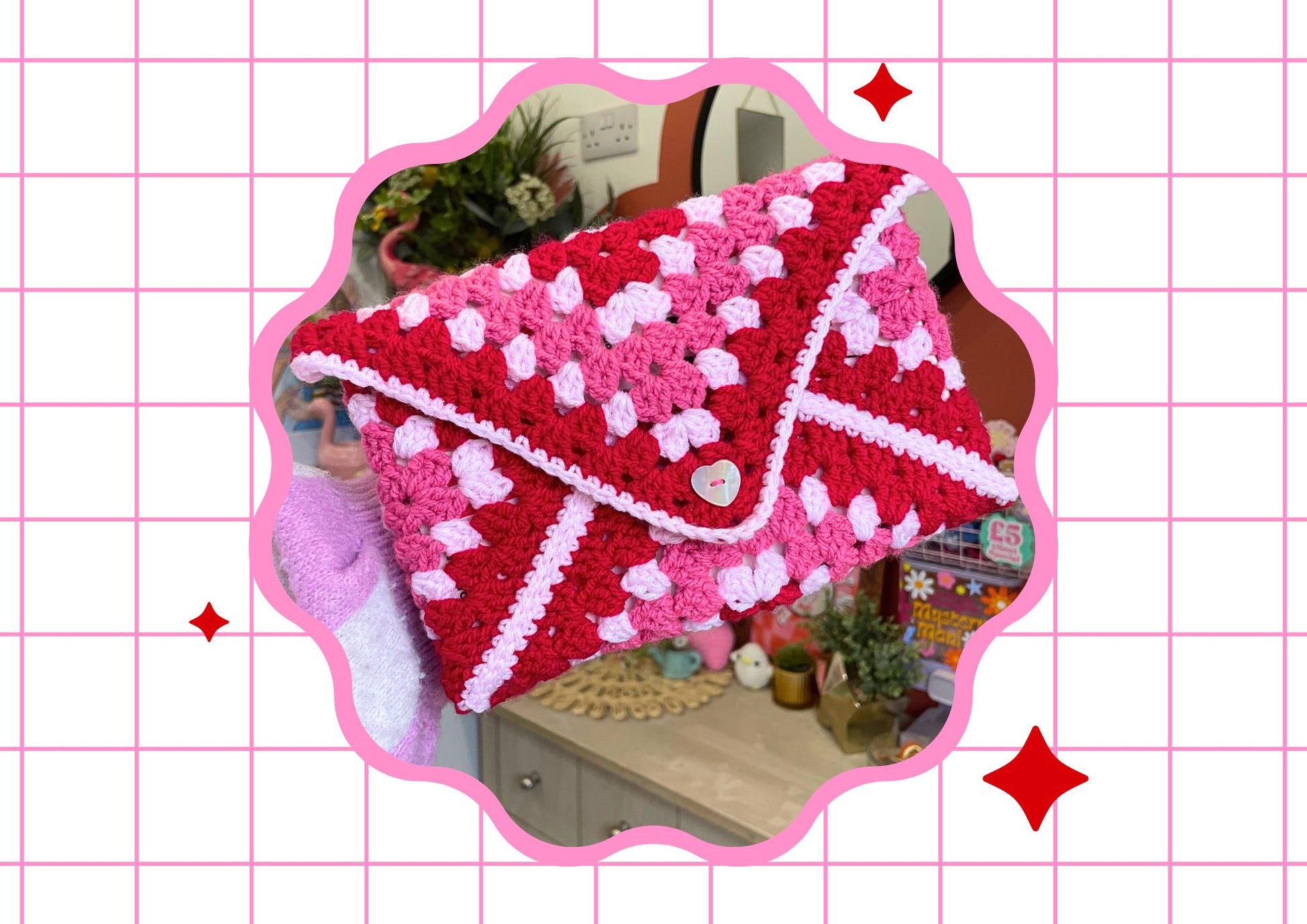 - Made from acrylic yarn & light pink sparkle yarn, can be stretched