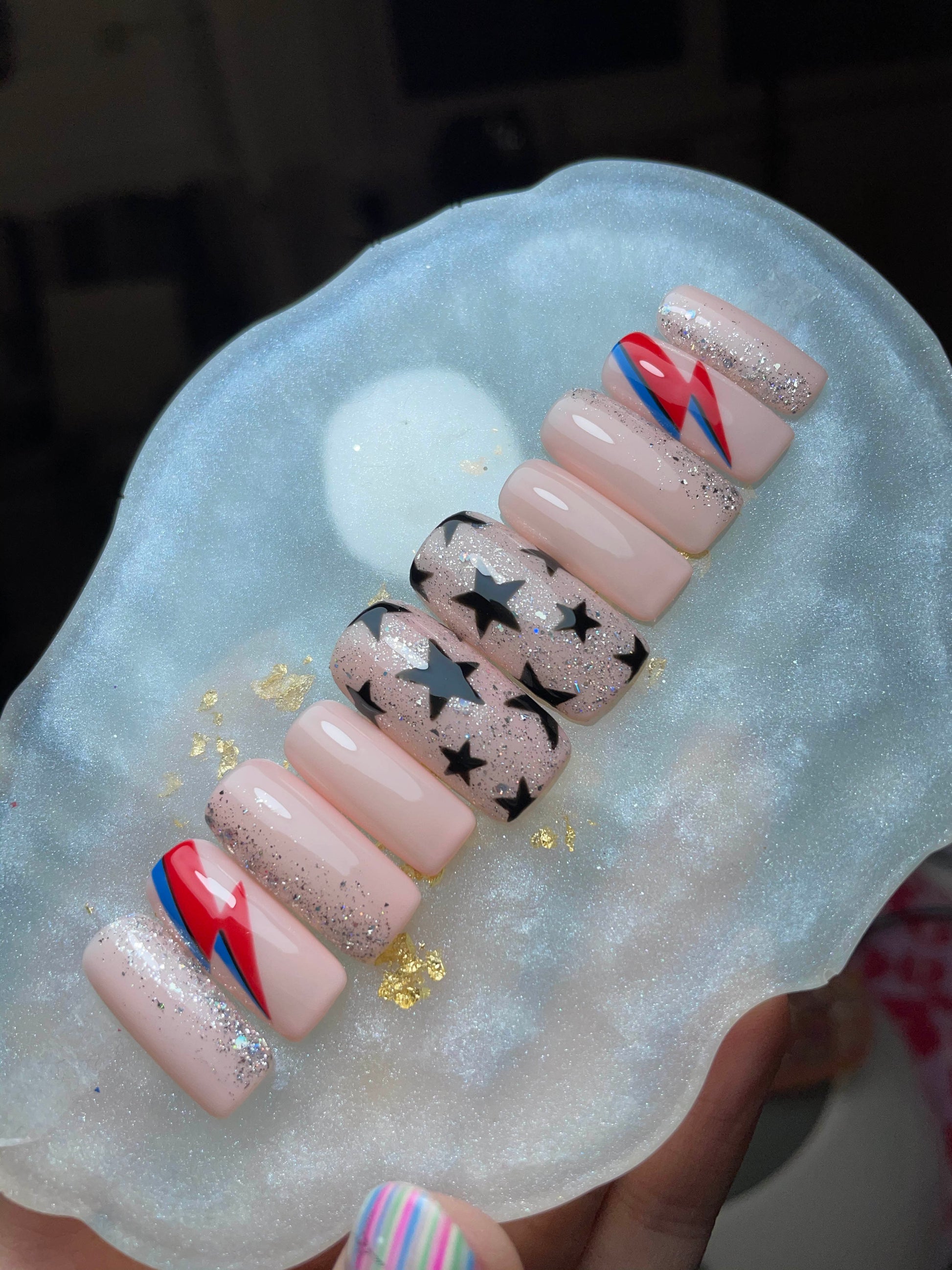 Luxurious press on nails, hand-painted in a nude* featuring David Bowie inspired design.