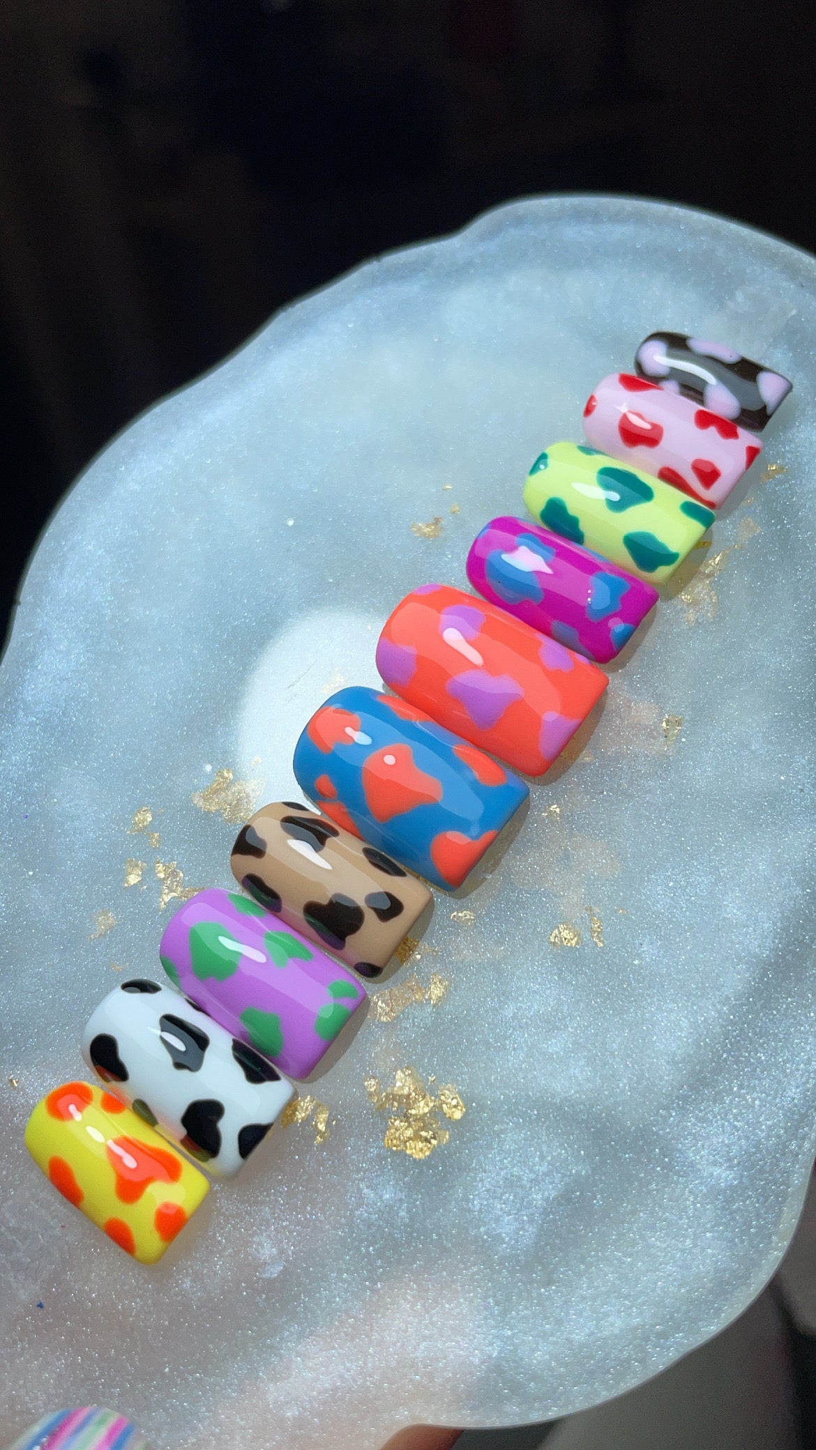 The picture shows a custom size set 10 nails in short coffin. You can either order custom Set of 10 to size of your own nails or in a set of 20, where you will receive 2 of each size.