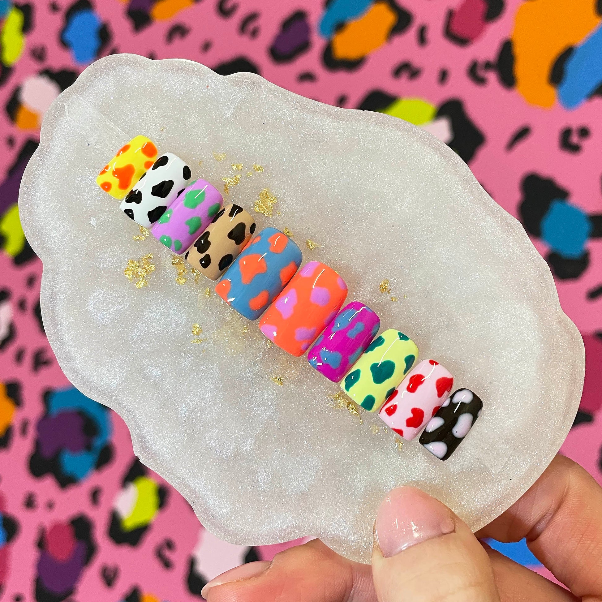 These nails have been hand-painted with The Gel Bottle, vegan and cruelty-free nail brand. The false nails themselves are high quality, designed to fit the nail shape perfectly and to make them look as natural as possible. The nails have also been top coated to help them last longer and to be super shiny.