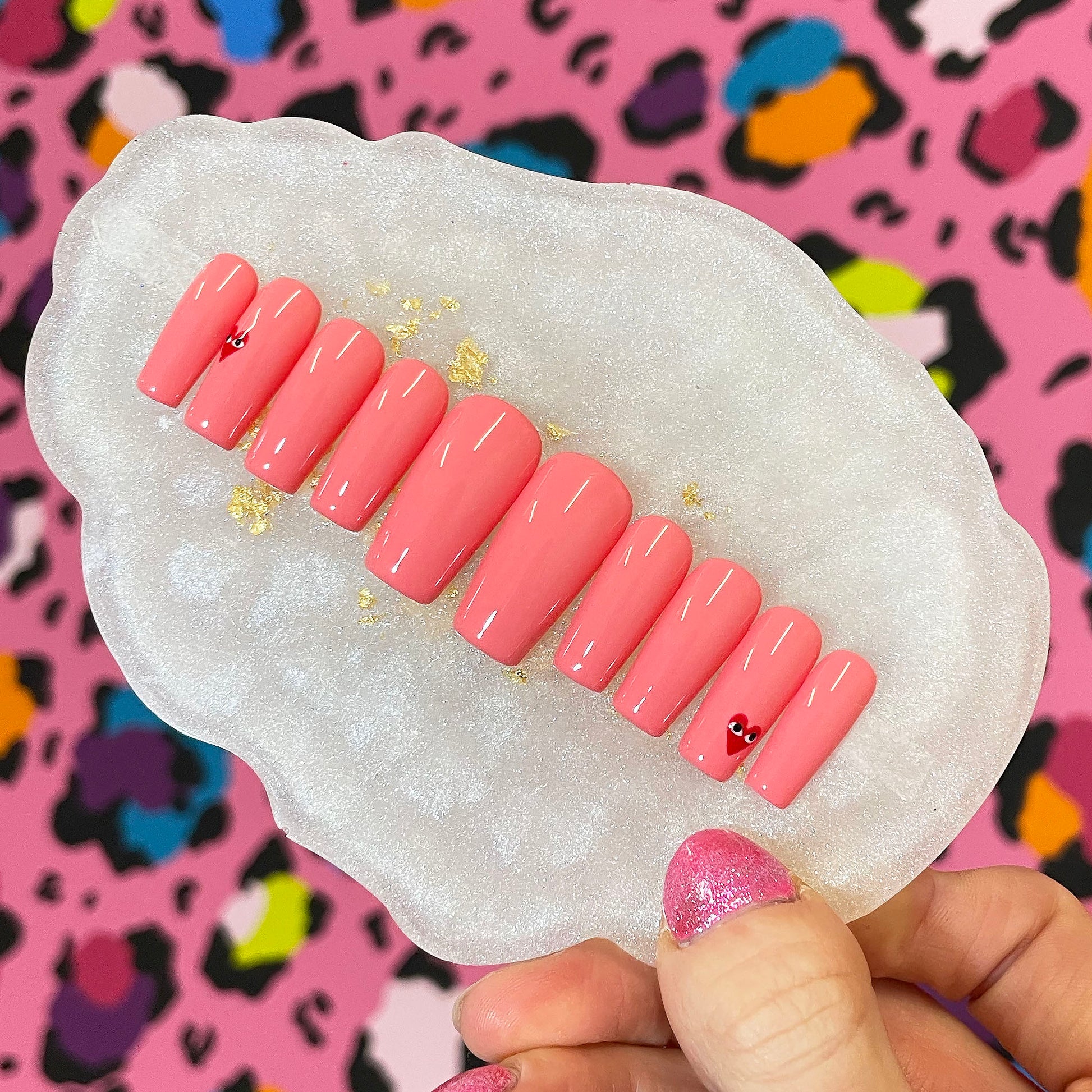 Luxurious press on nails, hand-painted in a pink* featuring hearts with eyes.