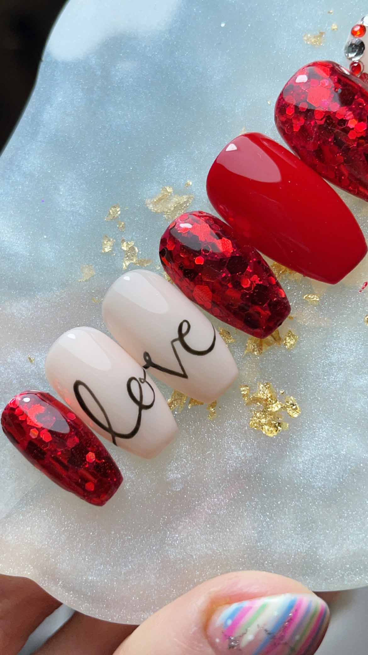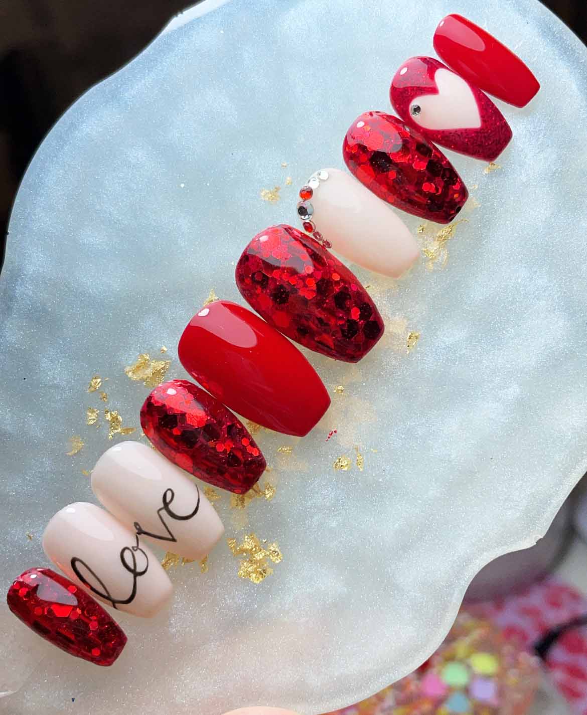 Luxurious press on nails, hand-painted in a red* with chunky glitter, gems and hand painted lettering.